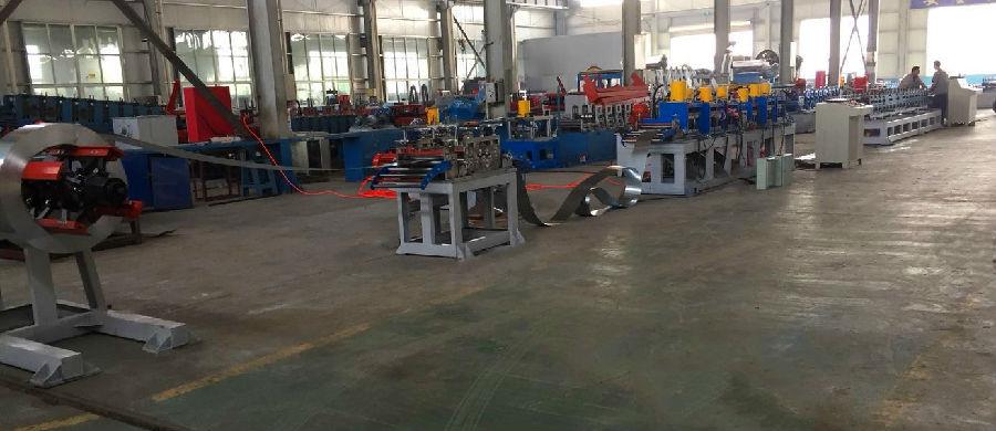 該機組設備占地約60平方米,主要包括:主動/被動放料裝置、校平送料裝置、高精密伺服送料、液壓連續沖孔裝置、分體可調式冷彎成型主機、數控定尺自動切折框裝置、電氣控制系統等部件組成;主要功能:伺服自動沖孔、切角、自動下料、自動成型、自動折框等。
